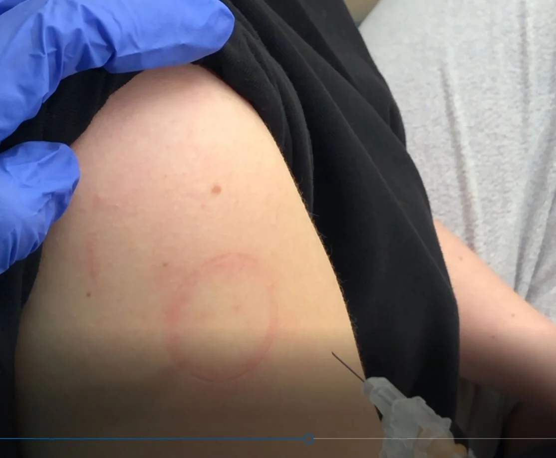Temporary mark on cooled skin left by Kool Shield at the injection site.